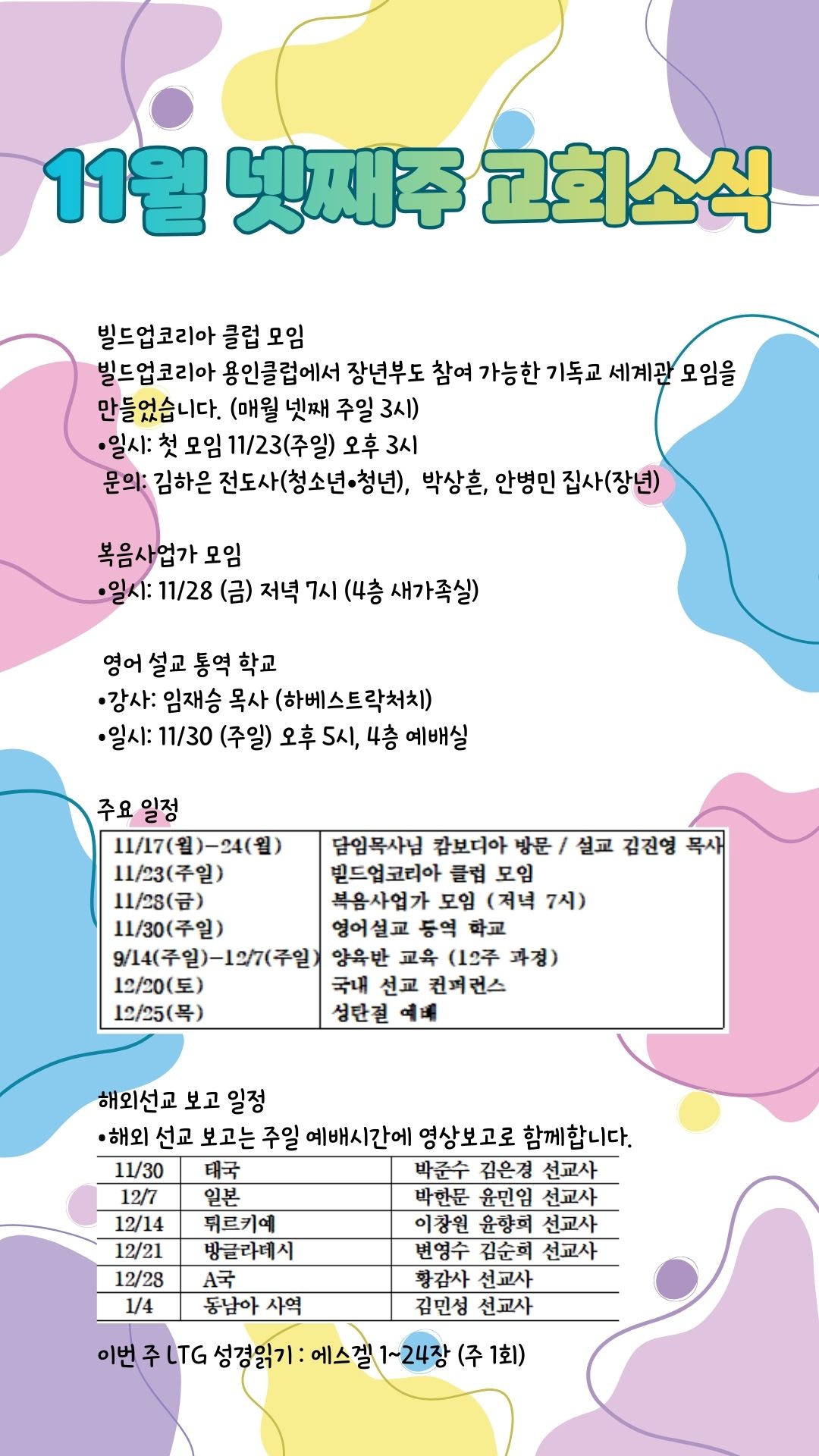 11월 23일 주일 설교 요약과 교회 소식(2부)