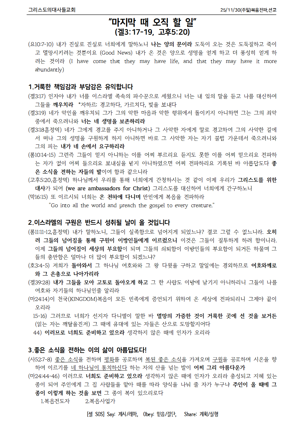 11월 23일 주일 설교 요약과 교회 소식(2부)