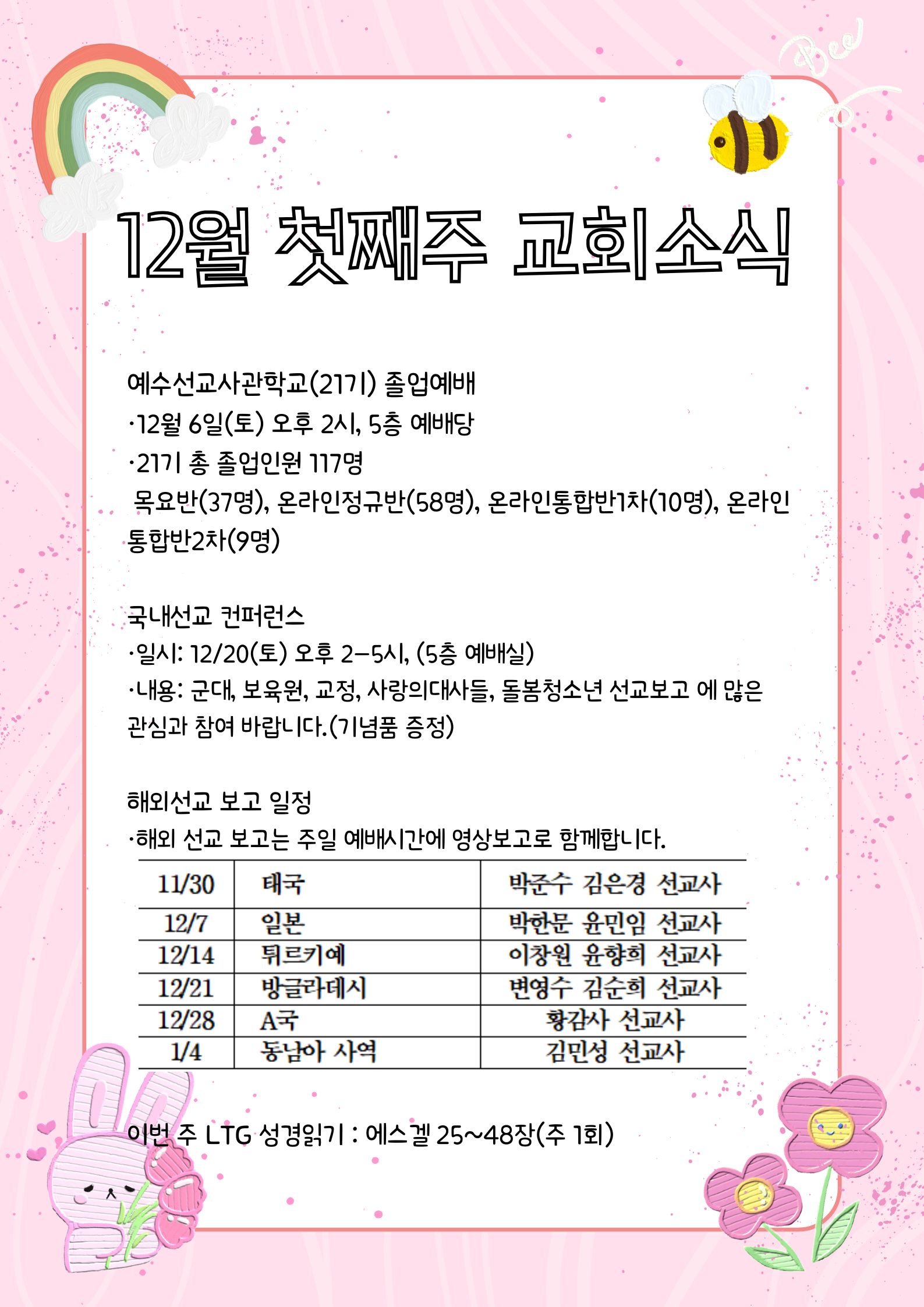 11월 23일 주일 설교 요약과 교회 소식(2부)