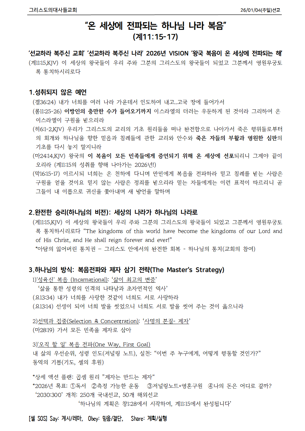 2026년 01월 04일 주일 설교 요약과 교회 소식