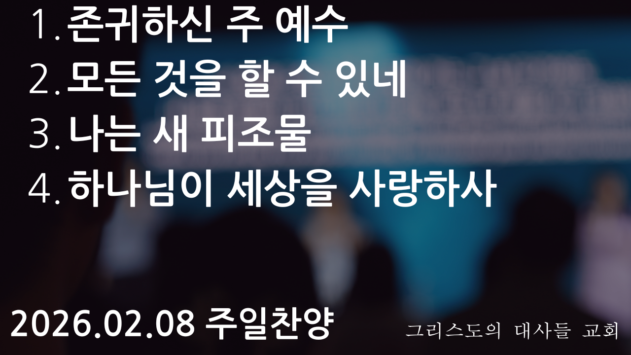 1. 존귀하신 주 예수 2. 모든 것을 할 수 있네 3. 나는 새 피조물 4. 하나님이 세상을 사랑하사