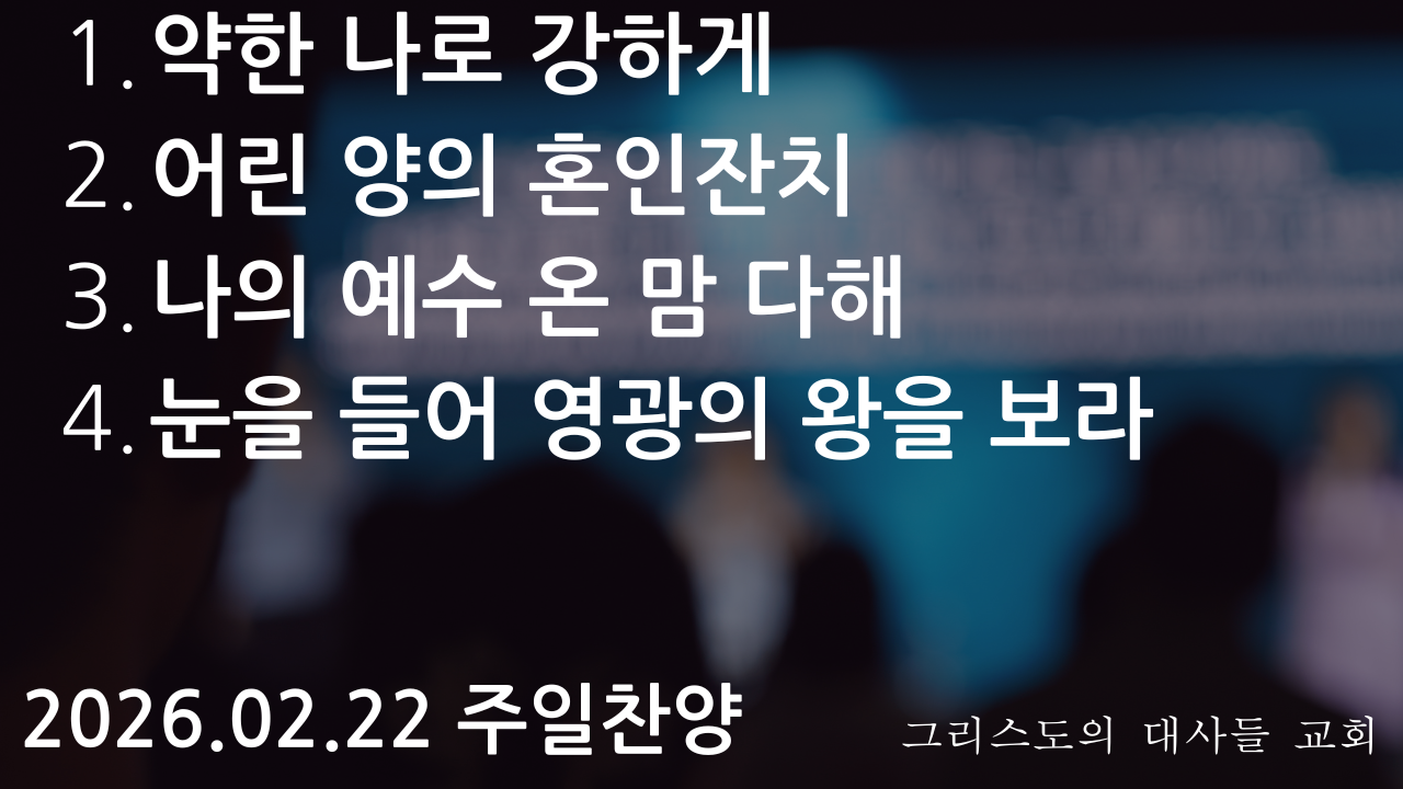 1. 약한 나로 강하게 2. 어린 양의 혼인잔치 3. 나의 예수 온 맘 다해 4. 눈을 들어 영광의 왕을 보라
