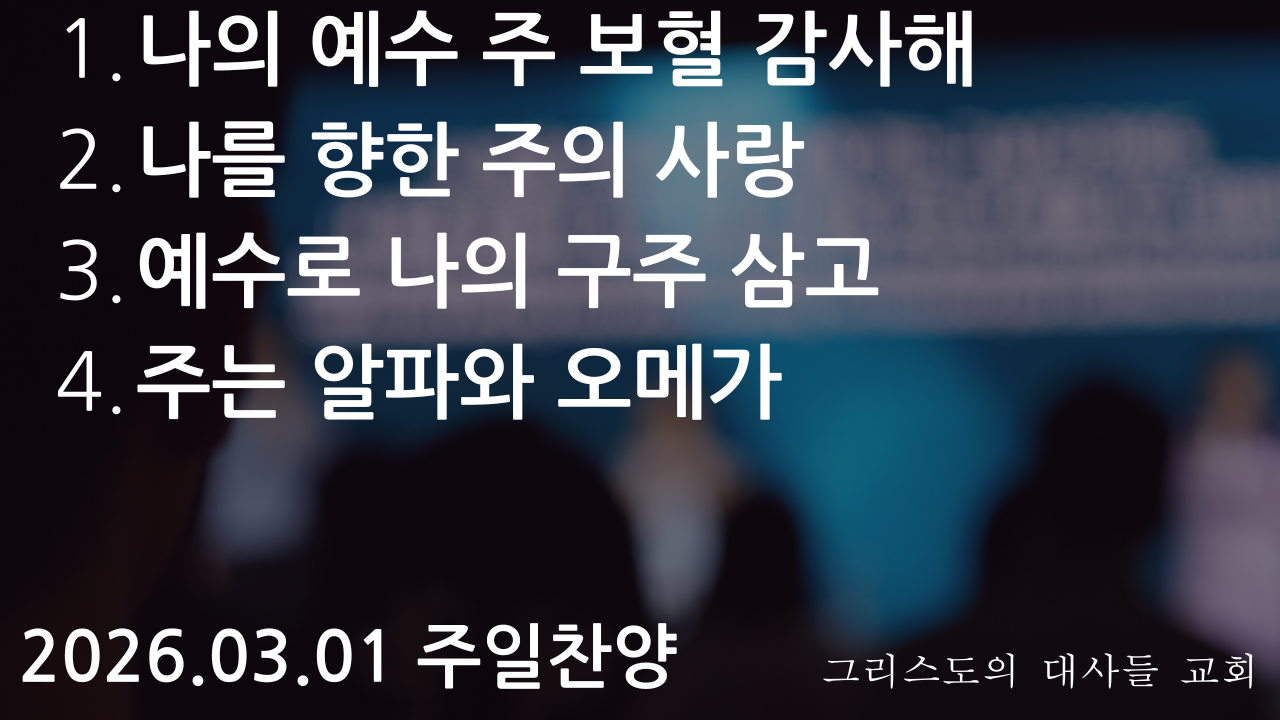 1. 나의 예수 주 보혈 감사해 2. 나를 향한 주의 사랑 3. 예수로 나의 구주 삼고 4. 주는 알파와 오메가